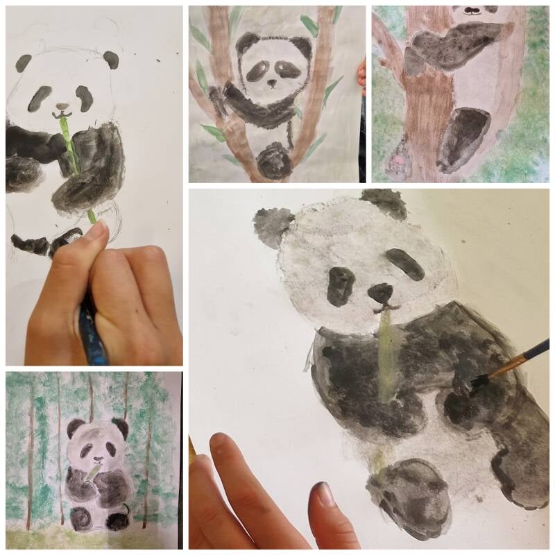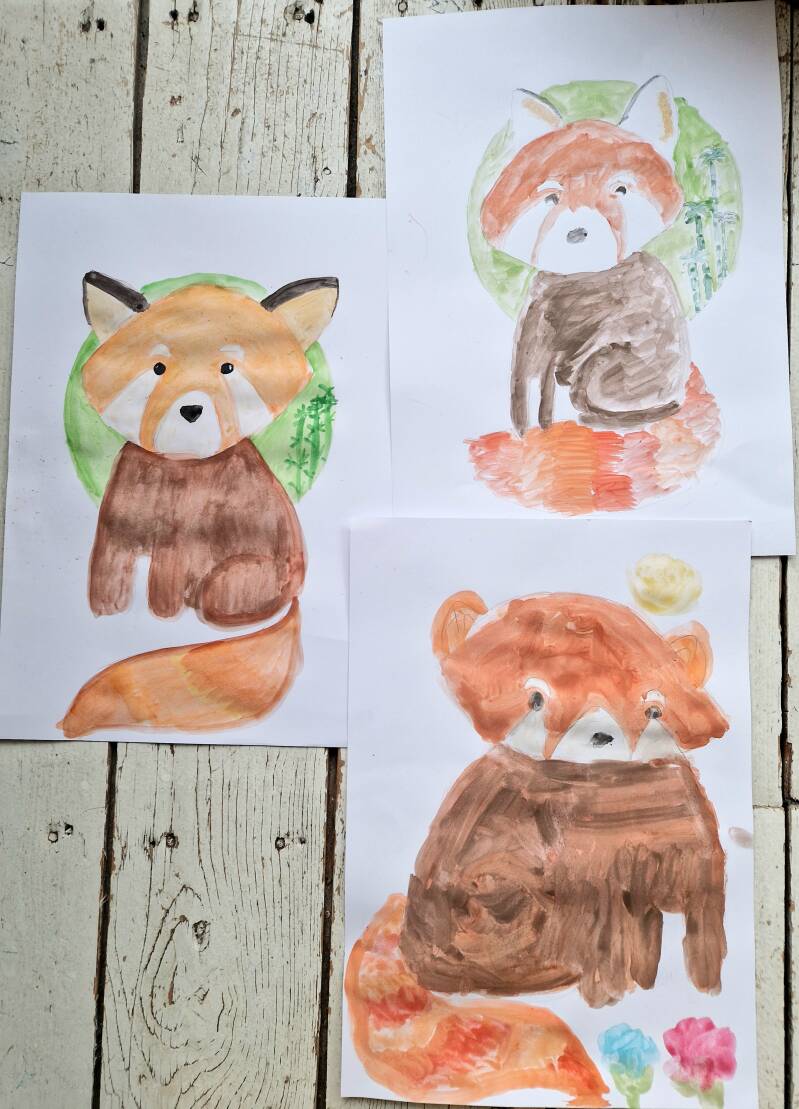Rode panda's met waterverf.