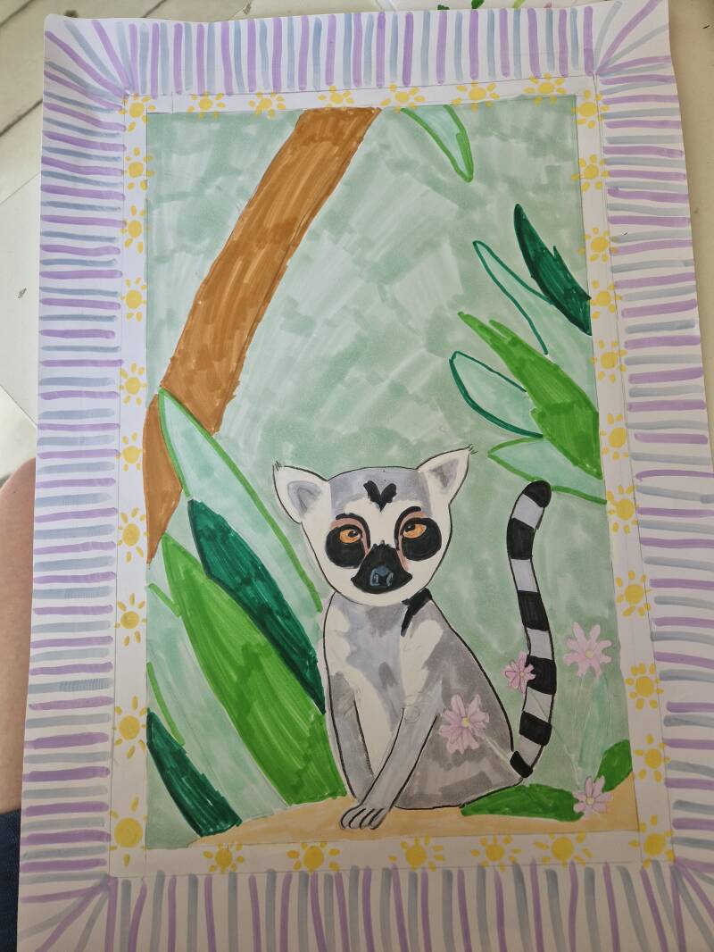 De opdracht was om een tropisch dier te maken in 'illustratie-stijl". Deze super mooie ringstaartmaki is gemaakt door Isabel 🥰
